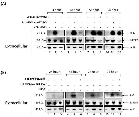 As HAND poses a threat to the quality of life of adequately suppressed HIV-1 patients, we next wanted to evaluate the role EVs had from infected macrophages on recipient CNS cells, specifically astrocytes. We have previously shown that EVs released from infected cells can cause an increase in the production of proinflammatory cytokines in uninfected recipient cells [19], and that these EVs can be found within the CSF of individuals infected with HIV-1 [8]. We therefore hypothesized that treating cells with EVs from infected macrophage-derived monocytes could elicit changes in astrocytes. To test this, U1 HIV-1-infected monocytes were differentiated into macrophages using PMA and treated twice with cART (darunavir, ritonavir, tenofovir, and emtricitabine) for 5 d. Donor cell viability was assessed to determine the optimal drug concentrations (Supplementary Figure S6A). Following incubation, total EVs were isolated using ultracentrifugation, and the EV concentration was normalized to control numbers using NTA (Supplementary Figure S6B). These EVs were used to treat two astrocyte cell lines, CCF-STTG1 and U138, at a 1:10,000 ratio of cell/EVs for 24, 48, 72, and 96 h. A sodium butyrate treatment was used as a positive control for inducing inflammatory signals [42]. Post-incubation, the astrocyte supernatants were analyzed for secreted inflammatory markers via Western blot analysis. The results presented in Figure 6A show an early strong secretion of IL-6 from CCF-STTG1 treated with EVs released from HIV-1-infected MDMs treated with cART at the 24 h time point, which sustained high levels of secretion (Supplementary Figure S7) through 96 h. Interestingly, the sodium butyrate treatment did not induce IL-6 secretion from the astrocytes until after 48 h. An inflammatory marker, MMP3, showed a slight increase (Supplementary Figure S7) in secretion induced by HIV-1 MDM EVs at 24 h but then remained at relatively consistent secretion levels compared to the untreated control. The EV and sodium butyrate treatments of U138 astrocytes had similar effects (Figure 6B) to those shown in Figure 6A.