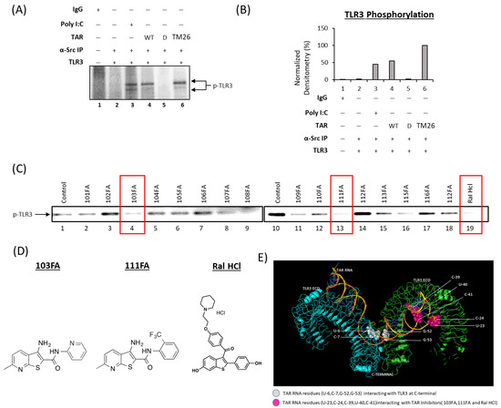 Purified c-Src kinase (Cat# sc-19; Santa Cruz Biotechnology; 10 ng), TLR3 protein (Cat# NBP2-36506; Novus Biologicals; Centennial, CA, USA; 100 ng), TAR RNA (10–100 ng), and TAR inhibitor drugs (101FA, 102FA, 103FA, 104FA, 105FA, 106FA, 107FA, 108FA, 109FA, 110FA, 111FA, 112FA, 113FA, 115FA, 116FA, 120FA, Ral HCl; 1 µM) were washed with TNE50 buffer (Tris-HCl (pH 7.4), 100 mM NaCl, 0.1 mM EDTA) and kinase buffer, followed by a 1 h incubation period at 37 °C with γ-32P ATP. The samples were fractionated using SDS/PAGE through a 4–20% Tris–glycine gel, which was stained with Coomassie blue, destained in destain buffer, and dried for 2 h. The dried gels were developed using PhosphorImaging and quantified using ImageQuant Software (Molecular Dynamics; version 5.2).