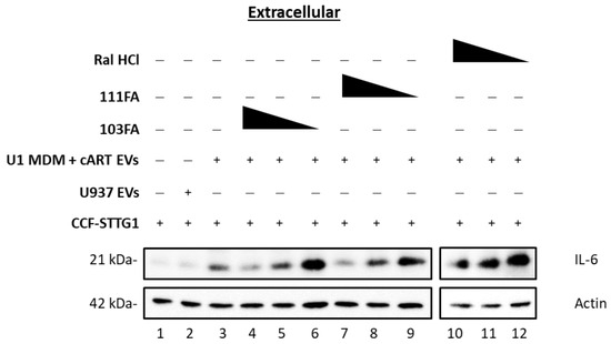 HIV-1 TAR inhibitors lower proinflammatory cytokine production in astrocytes. U937 and U1 cells were cultured for 5 days. U1 monocytes were differentiated into MDMs using PMA (100 nM) and treated ± cART cocktail (10 µM of darunavir, emtricitabine, tenofovir, and 5 µM of ritonavir) for 5 days. EVs were isolated using ultracentrifugation and assessed for concentration and particle size using ZetaView NTA to equilibrate EV concentrations. EVs were used to treat astrocytes (CCF-STTG1; 1 × 106) at a 1:10,000 concentration (cell/EVs ratio). CCF-STTG1 cells were treated with ± EVs from U937 cells, as well as U1 MDMs that were treated with cART (10 µM of darunavir, emtricitabine, tenofovir, and 5 µM of ritonavir) at a 1:10,000 concentration (cell/EVs ratio), and ±titration of TAR inhibitors (100, 10, and 1 nM; 103FA, 111FA, and Ral HCL) for 3 days. EVs from supernatants were enriched using NT80/82 particles and analyzed for the presence of IL-6 and Actin using Western blot.