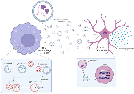 Autophagy is a dynamic cellular pathway that is responsible for the degradation/turnover of proteins and organelles, involving a series of coordinated events facilitated by numerous cellular proteins. The autophagy pathway, specifically secretory autophagy, intersects with pathways involved in EV biogenesis (for a complete review, see Pleet et al. [22]). In the context of disease, specifically viral infection, this process can be deregulated via viral proteins and can contribute to pathogenesis. New evidence suggests that viral proteins may not be the only catalyst for autophagy deregulation. Interestingly, the NRTI zidovudine (AZT) elicited mitochondrial DNA depletion in liver parenchymal cells, which in turn decreased pro-autophagy proteins and increased autophagy inhibitor activity. These effects resulted in increased accumulation of autophagosomes and proteins selectively degraded by autophagy [23]. Additional findings suggest these results are not limited to the liver, extending to cell types to include myocytes and adipocytes [24,25]. As AZT penetrates the BBB, albeit at low concentrations, these data may implicate cART drugs in the deregulation of autophagy in CNS cells. Further evidence has shown that Tenofovir and Emtricitabine can deregulate autophagy in circulating macrophages, measured by changes in the levels of autophagy proteins such as LC3-II and SQSTM1/p62 [26].