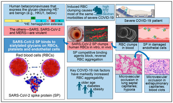Key facets of the biochemical underpinning of the severe morbidities of COVID-19. Reproduced under CC-BY 4.0 from Scheim et al. 2023 [1]. Lower left panel: SARS-CoV-2 SP, which is positively charged, binds to RBCs, platelets and endothelial cells, the surfaces of which are densely coated with negatively charged sialylated glycans. Upper left panel: the two human betacoronaviruses that express the SA-cleaving enzyme HE are benign, while the other three—SARS, SARS-CoV-2 and MERS—are virulent. Upper center panel: RBC aggregation experimentally induced in vivo by injecting high molecular weight dextran (HMWD) caused most of the same morbidities of severe COVID-19. Middle center panel: An interlaced sheet of RBCs in the hemagglutination assay (left) and RBC clumps in zebrafish embryos (right) are shown, both induced by the introduction of SARS-CoV-2 SP. Lower center panel: Three key risk factors for COVID-19 morbidity—older age, diabetes and obesity—are each associated with markedly increased RBC aggregation. Middle right panel: An electron microscopic image of RBC clumps in blood is shown and SP in damaged endothelial cells is depicted, with both being commonly observed in severe COVID-19 patients. Lower right panel: Microvascular occlusion in lung septal capillaries is associated with hypoxia, and microvascular occlusion in extrapulmonary capillaries is associated with blood clots.