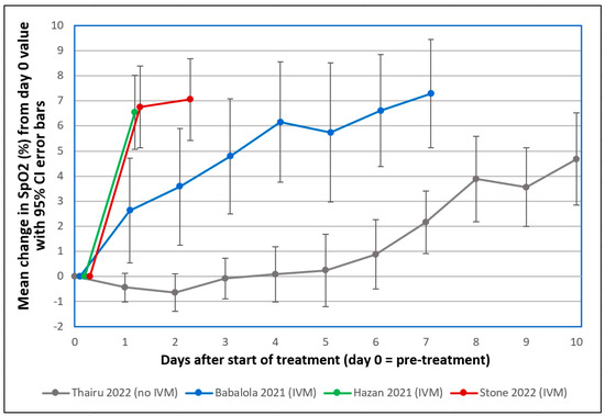 The following are available online at https://www.mdpi.com/article/10.3390/v16040647/s1, Table S1: Changes in SpO2 for 34 COVID-19 patients treated with IVM, doxycycline and zinc, as reported by Stone et al. (2022), Table S2: Changes in SpO2 for 19 COVID-19 patients treated with IVM, doxycycline and zinc, as reported by Hazan et al. (2021), Table S3: Changes in SpO2 for 19 COVID-19 patients treated with IVM, zinc and vitamin C, with some also given azithromycin and hydroxychloroquine, as reported by Babalola et al. (2021), Table S4: Changes in SpO2 for 26 COVID-19 patients treated without IVM using different combinations of lopinavir/ritonavir, remdesivir, azithromycin, enoxaparin, zinc sulfate and vitamin C, as reported by Thairu et al., Table S5: Means and standard errors of SpO2 changes from day 0 to day 1 and from day 0 to day 2 for the full set of 26 patients from Thairu et al. (2022) and for the subset of 18 patients who were on room air (without oxygen supplementation or ventilation).