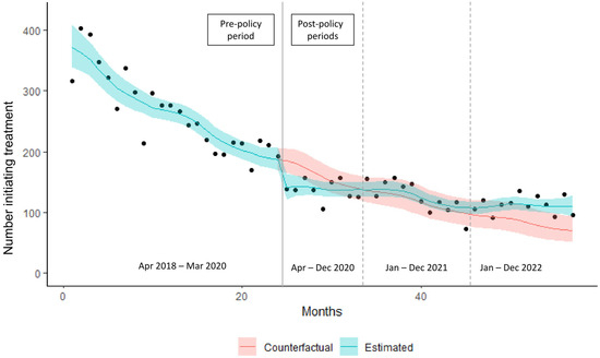 The study outcome was the monthly number of individuals who initiated HCV treatment, where initiation was defined as a first dispensation of HCV medication since the start of 2015 (see Table S2 in the Supplementary Materials for a list of relevant HCV medications). After our preliminary analysis of pre-policy data identified a non-linear trend in HCV treatment initiation, we chose to adopt an approach to interrupted time series analysis with generalized additive models (GAMs), which has been demonstrated to perform well in modelling post-policy changes in outcomes in the presence of non-linearity [43]. The statistical models used a log link function with a negative binomial distribution, which was chosen because it was appropriate for modelling count data and preliminary analyses, assuming a Poisson distribution showed overdispersion. Models included a binary variable to evaluate a post-policy level change, a smoothing function for the pre-policy trend, a smoothing function to adjust for seasonality, and a smoothing function for the post-policy trend [43]. Based on a review of autocorrelation and partial autocorrelation plots, we also adjusted our analyses for autocorrelation.