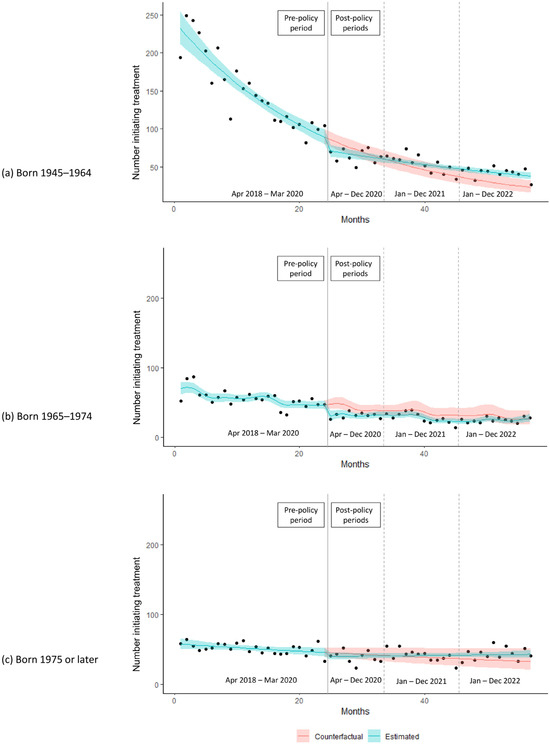 During the pre-policy period (April 2018 to March 2020), the median monthly number of individuals initiating HCV treatment in the full BC population was 256 (interquartile range 89.5) (Table S3). The median monthly number of individuals initiating HCV treatment during this period was higher among males compared to females, higher among those born from 1945 to 1964 (“baby boomers”) compared to other birth cohorts, and higher among people who inject drugs compared to those who do not inject drugs (Table S3).