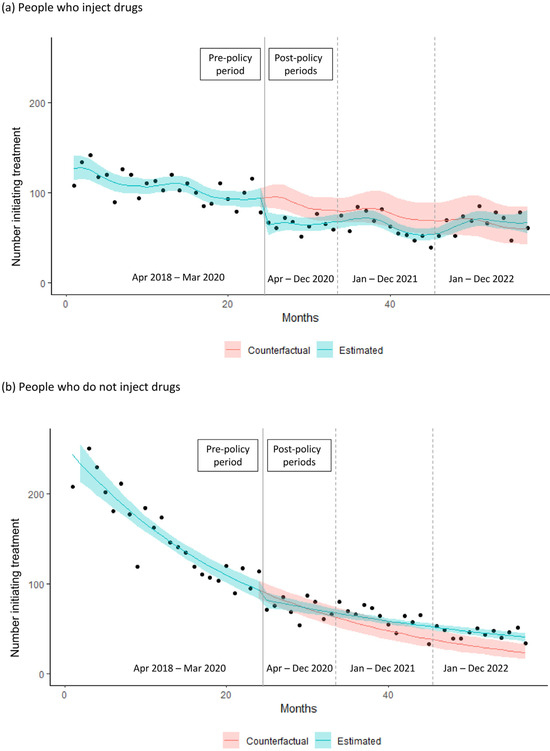 The strengths of our study include the use of a rigorous interrupted time series design, which enabled us to account for the pre-existing trend of HCV treatment initiation even in the presence of non-linearity, and the use of linked data covering most of the BC population. We also included stratified analyses to examine HCV treatment initiation in specific populations, including two groups identified as priority populations in Blueprint to inform hepatitis C elimination efforts in Canada: people born between 1945 and 1974 (who account up to three-quarters of HCV infections) and people who inject drugs (who account for 85% of new HCV infections) [3]. However, our study was subject to limitations. We used pre-policy data to estimate counterfactuals for HCV treatment initiation for multiple periods, but counterfactuals for the period from January to December 2022 might be less reliable because this period was further from the pre-policy period. When we classified patients by injection drug use status for stratified analysis, it is likely some misclassification occurred, although this was mitigated by using a modified version of a validated algorithm [42]. We were unable to include analyses of other priority populations, namely, Indigenous peoples, people with experience in federal or provincial prisons, immigrants and newcomers from countries where HCV is common, and gay, bisexual, and other men who have sex with men [3].