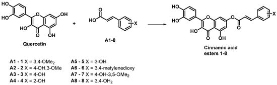 As these natural products have shown positive effects on human health, there has been an increasing effort to characterize their biological potential. In this context, we have carried out extensive research into flavonoids [36,37,38,39,40] and evaluated their efficacy as a complementary therapy to more specific antiviral compounds. More specifically, we have developed esters of cinnamic acids with quercetin to evaluate their cytotoxicity and potential antiviral activity in vitro.