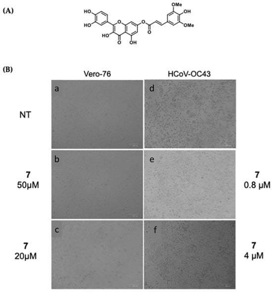 (A) The chemical structure of ester 7 and (B) validation of the effect of 7 (50, 20, 4, and 0.8 µM) on the Vero-76 HCoV-OC43-infected monolayers. Untreated control cells (a), treated and infected cells with 50 µM (b), treated and infected cells with 20 µM (c), treated and infected cells with 4 µM (f), treated and infected cells with 0.8 µM (e), infected cells (d). Pictures of cell morphology were taken at 120 h post-infection using a ZOE Fluorescent cell imager (Bio-Rad, Hercules, CA, USA) (bar size = 100 μm, magnification, 20×).