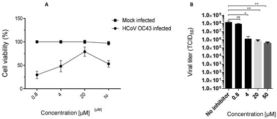 The antiviral activity of compound 7, selected as lead, against the OC43 strain was confirmed in a virus yield reduction assay (YRA) against Vero-76, as reported in Figure 4B. The concentrations of 50, 20, 4 and 0.8 µM (not cytotoxic) were employed, and a significant dose-dependent reduction in the viral titer was observed. An interesting reduction in the OC43 titer (2 logs) was also detected at a low concentration of 4 µM (Figure 4B).