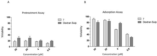 To determine whether compound 7 was able to protect cells from hCoV-OC43 infection, a pre-treatment assay was then performed by incubating Vero-76 cell monolayers (2 h) with different concentrations of the conjugate (50, 20, 4, 0.8 μM). Dextran sulphate (DS), a broad-spectrum RNA/DNA-enveloped virus attachment inhibitor, was employed as a negative control.