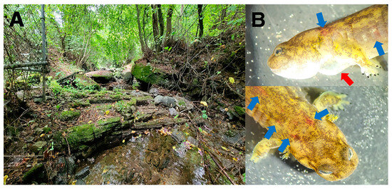 The study site and Onychodactylus koreanus. Landscape of the study site (A) and a diseased O. koreanus ((B); red arrows indicate edema and blue arrows indicate ecchymosis), observed at the study site.