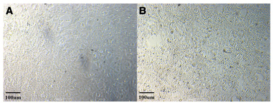 EPC cells were cultured in 75 cm2 flasks (SPL, Seoul, Republic of Korea) at 22 °C with 5% CO2 in Dulbecco’s Modified Eagle Medium (DMEM, Gibco, Grand Island, NY, USA) supplemented with 10% fetal bovine serum (FBS, Gibco, Grand Island, NY, USA) and 1% antibiotic–antimycotics, as described previously [30]. EPC cells were sub-cultured (1:4) every 5–6 days by washing with PBS and treated with 3 mL of 0.25% trypsin and 0.53 mM EDTA (Gibco, Grand Island, NY, USA) to detach adherent cells [31]. EPC cells were collected by centrifugation at 1000 rpm for 10 min and resuspended in the growth medium. After inoculation of virus isolates, EPC cells were maintained at 22 °C in Dulbecco’s Modified Eagle Medium (DMEM) supplemented with 2% FBS, and 1% antibiotics–antimycotics. Ranavirus-infected cells showing CPE were stored at −80 °C.