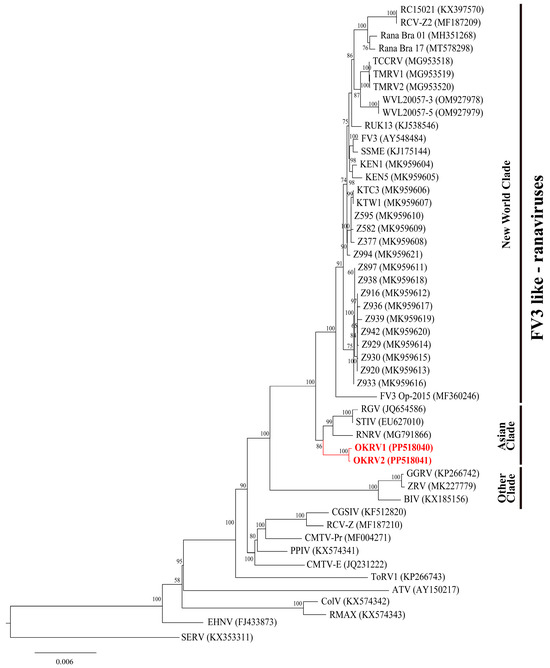 In the phylogenetic tree constructed using the 45 core ORF genes from whole-genome sequencing of 37 FV3-like ranaviruses, three distinct lineages were identified (Figure 3): the New World clade, the Asian clade, and the remaining clade. The basal position of out-group ranaviruses (CMTV-, ATV-, and EHNV-like ranaviruses) to FV3-like ranaviruses in the three was similar to that observed in previous studies [3,12,14]. OKRV1 and 2 formed an independent clade within the monophyletic clade of Asian FV3-like ranaviruses (STIV, RGV, and RNRV). The Asian clade is a sister group of the New World clade.