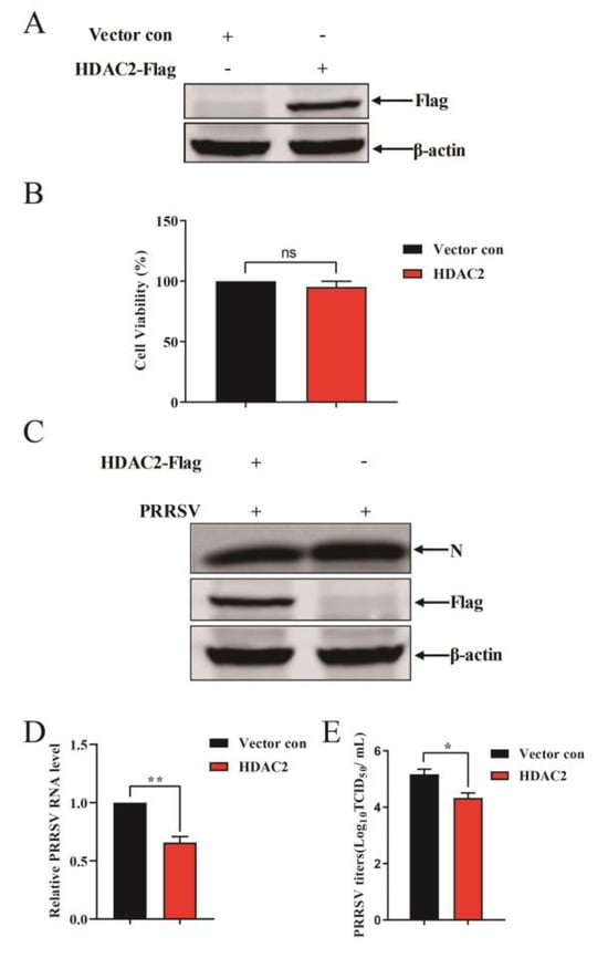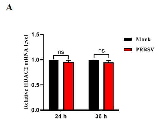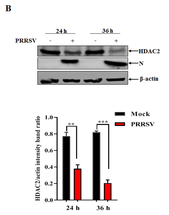 PRRSV infection reduces the HDAC2 endogenous expression. (A,B) PRRSV infection leads to the downregulation of HDAC2. PAMs were infected with PRRSV at an MOI of 0.1, and samples were collected at specific time points. The levels of HDAC2 mRNA and protein were determined by RT-qPCR (A) and Western blotting (B). The results represent three independent experiments (the means ± SD). ns means no significance **, p < 0.01, ***, p < 0.001. The p value was calculated using Student’s t-tests.