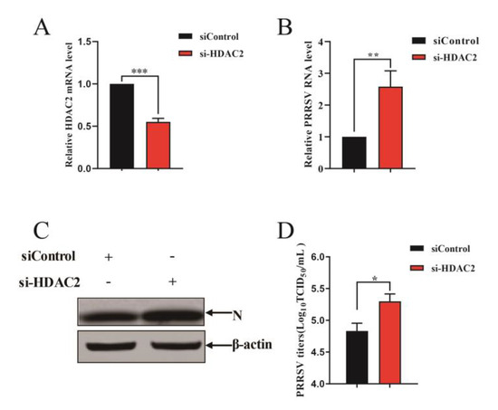 Next, we further characterized the antiviral activity of HDAC2 against PRRSV. We knocked down endogenous HDAC2 expression in PAMs cells using specific small interfering (si) RNAs (si-HDAC2). Negative control siRNA (siControl) was used as a reference. After 24 h of transfection, RT-qPCR analysis revealed a significant reduction in HDAC2 expression in cells transfected with si-HDAC2 compared to those transfected with siControl (Figure 3A). This validated the effectiveness of si-HDAC2 in knocking down HDAC2 expression and allowed us to use it in subsequent experiments. Next, PAMs cells were infected with PRRSV 24 h after siRNA transfection, and the infection was allowed to proceed for an additional 24 h. RT-qPCR analysis showed that knockdown of HDAC2 in PAMs cells resulted in a significant increase in PRRSV RNA levels compared to control cells (Figure 3B). Consistent with this finding, Western blot analysis demonstrated an increase in the protein level of the PRRSV N protein in cells transfected with si-HDAC2 (Figure 3C). Finally, we quantified the PRRSV virion production in PAMs cells following HDAC2 knockdown. Using the TCID50 assay, we found that cells transfected with si-HDAC2 produced significantly higher titers of PRRSV compared to cells transfected with the negative control siRNA (Figure 3D). All in all, these results provide further evidence for the antiviral function of HDAC2 against PRRSV infection. By both overexpressing HDAC2 and knocking it down, we have validated its role in restricting PRRSV replication in PAMs cells.