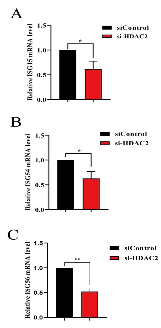 HDAC2 induced upregulated ISG expression. (A–C) PAMs cells were transfected with either si-HDAC2 or siControl for 24 h. Subsequently, the cells were treated with IFN-α for an additional 12 h to stimulate the antiviral response. After the treatment, RNA was extracted from the harvested cells for further analysis. The transcription of antiviral genes, ISG15 (A), ISG54 (B), and ISG56 (C), were determined by RT-qPCR using the primers in Table 1. The results represent three independent experiments (the means ± SD). *, p < 0.05, **, p < 0.01. The p value was calculated using Student’s t-tests.