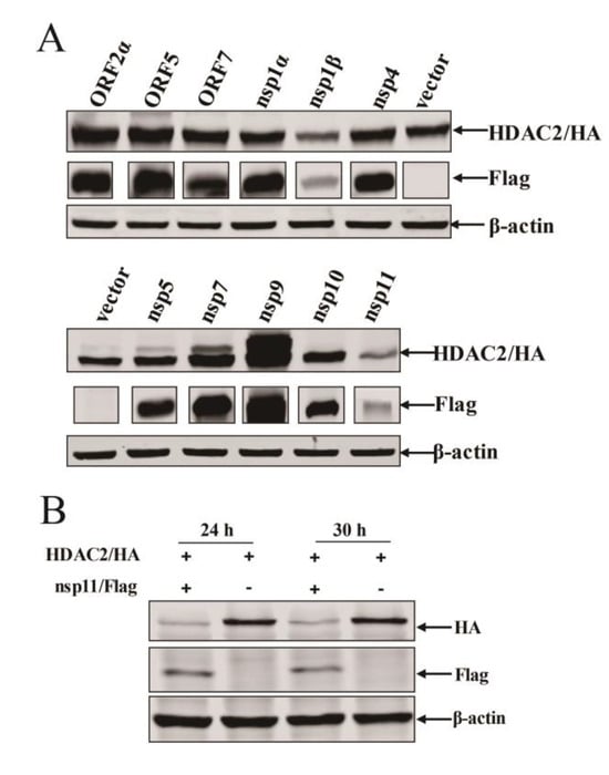 The expression of HDAC2 was inhibited by PRRSV nsp11. (A) HEK293T cells were co-transfected with plasmids containing gene-encoding HDAC2 and plasmids containing individual PRRSV-encoded protein. At 24 h post-transfection, cells were lysed, and immunoblots were performed to analyze protein expression. (B) Marc-145 cells were co-transfected with HDAC2 expression plasmid along with Flag-nsp11 plasmid followed by assessment of HDAC2 expression by Western blotting.