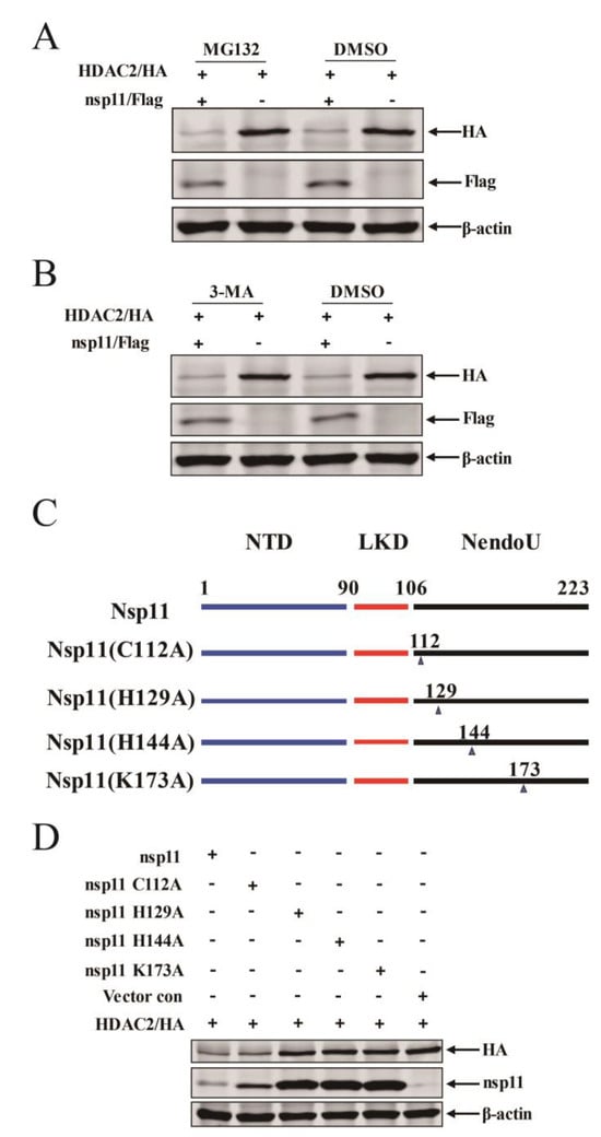To gain a deeper understanding of the mechanism underlying nsp11-mediated HDAC2 expression reduction, we examined the predominant degradation pathway responsible for HDAC2 degradation. HEK293T cells were co-transfected with plasmids encoding HDAC2 and Flag-tagged nsp11, followed by treatment with either the protease inhibitor MG132 or the autophagy inhibitor 3-methyladenine (3-MA). Western blotting was performed to assess the amount of HDAC2 protein expression. As shown in Figure 6A, treatment with MG132 did not restore the HDAC2 protein level in nsp11-transfected cells, suggesting that HDAC2 degradation is not mediated by the proteasome-dependent pathway. Similarly, treatment with 3-MA also failed to rescue HDAC2 expression (Figure 6B), indicating that autophagy is not involved in this process.