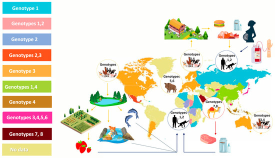 HEV genotypes that can infect people belong to the species Paslahepevirus balayani and Rocahepevirus ratti. P. balayani includes eight genotypes (HEV-1 to HEV-8). HEV-1 and HEV-2 exclusively infect humans and are transmitted as waterborne infections in areas with poor sanitation conditions. HEV-1 strains are distributed in Asia and most countries in sub-Saharan Africa [28]. HEV-2 was identified during a hepatitis E outbreak in Mexico in 1986; additionally, several studies have reported that HEV-2 is distributed in Africa [29,30,31,32]. HEV-3 and HEV-4 are identified as zoonosis, infecting humans and many animal species [33]. HEV-5 and HEV-6 were observed among wild boars [34,35]. HEV-7 infects mostly dromedary camels; however, its zoonotic potential has been demonstrated as well, albeit in a single human case (an immunosuppressed patient from the Middle East, who consumed camel meat and milk) [36,37]. HEV-8 was identified among Bactrian camels in China [36]. Figure 1 presents Paslahepevirus balayani animal species distribution.