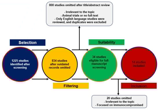 During the literature search, conducted from January 2021 until March 2024 using the PubMed database, 1225 articles were initially identified as potentially relevant. The key words applied included SARS-CoV-2 infection, long COVID, immune response, inflammatory, vaccination, symptoms, and transmission. Specifically, the search strategy included the following query string: SARS-CoV-2 infection AND vaccination AND immunity AND symptoms AND Long COVID. Expanding the query string further resulted in a restricted article pool. Subsequently, 391 studies were considered obsolete and omitted from consideration. Following a close review of these 834 studies, 800 were eliminated due to irrelevant subject matter, animal experiments, or studies prior to 2021. Only English-language papers were reviewed, and duplicates were excluded. Further rigorous assessments of the full texts of the remaining 34 studies led to the exclusion of an additional 20 studies. Consequently, 14 studies were ultimately deemed appropriate and included in the systematic review, strictly adhering to the study topic. Two independent researchers reviewed the articles and hand-searched literature. Disagreements were discussed and resolved. A graphical summary of the literature retrieval flow is presented in Figure 1.