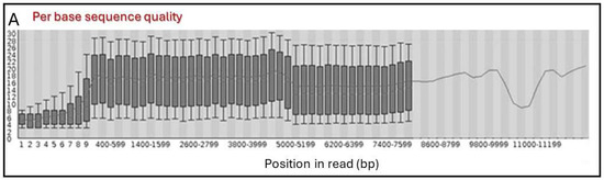 The tools used in the secondary analysis required sequence packages containing fewer than one million sequences. For this purpose, the tool LUMC/fastaq filter (https://github.com/LUMC/fastq-filter (accessed on 7 March 2023)) was used to optimize the FASTQ packages, which were filtered by read size (between 4 and 6 kb, an appropriate size for the phagemids composing the library) and sequence quality (phred scores higher than 15, which means that the possibility of sequencing errors is less than 3%), removing low-quality sequences from the packages.