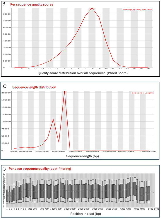 Quality metrics for Oxford Nanopore sequencing of the phage-displayed libraries. (A) Distribution of quality scores according to read position; in the boxplot, black lines represent medians, the boxes show the lower and upper boundaries of the first and third quartiles, respectively, and the lines show the mean quality scores. (B) Mean per-read quality score diagram. (C) Read length distribution. (D) Distribution of quality scores according to read position after sequence filtering, where black lines represent medians, the boxes show the lower and upper boundaries of the first and third quartiles, respectively, and the lines show the mean quality scores. All the analyses were performed using the FastQC toolkit. The data shown correspond to one of the multiplexed samples; however, the data recorded for all the samples presented similar profiles.