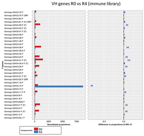 Pairwise analysis of VH gene composition of the unpanned immune library (red) and its fourth round of selection (blue). Normalized proportions (left chart) and 95% confidence intervals of the differences in proportions (right chart) for each VH subfamily. The color of the intervals depicts test interpretation: non-significant (red), significant for all p-values (blue), significant for at least 2 tests (pink), and significant for only the Benjamini–Hochberg test (green).