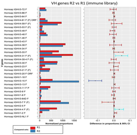 Pairwise analysis of VH gene composition of round 1 (red) and round 2 (blue) of selection of the immune library. Normalized proportions (left chart) and 95% confidence intervals of the differences in proportions (right chart) for each VH subfamily. The color of the intervals depicts test interpretation: non-significant (red), significant for all p-values (dark blue), and significant for one test (light blue).