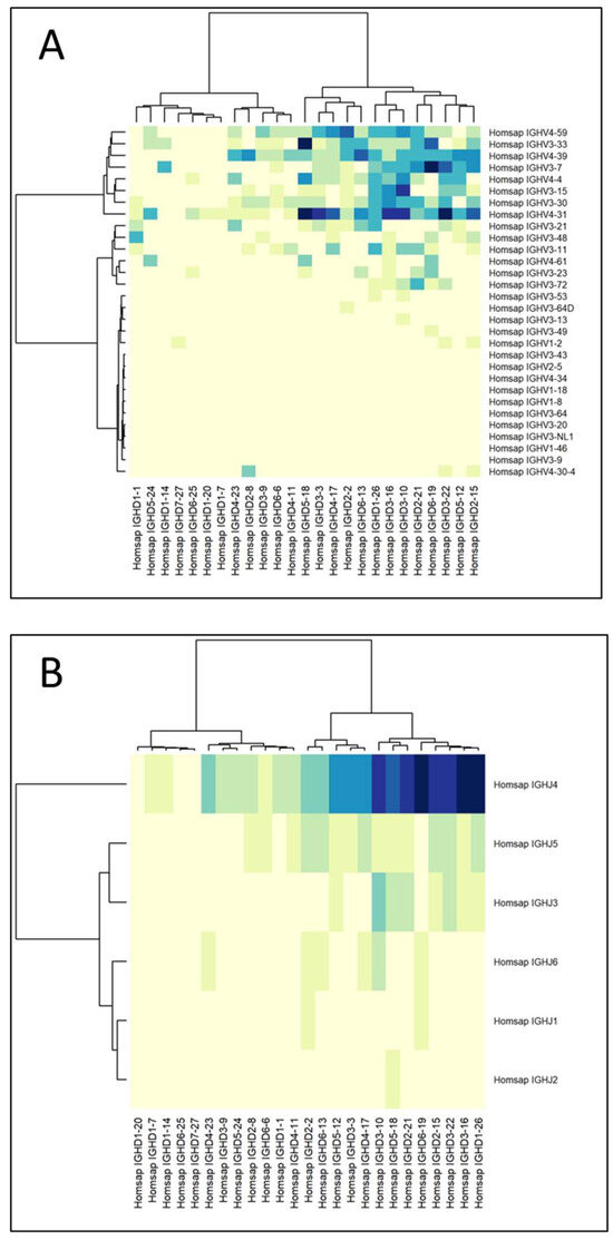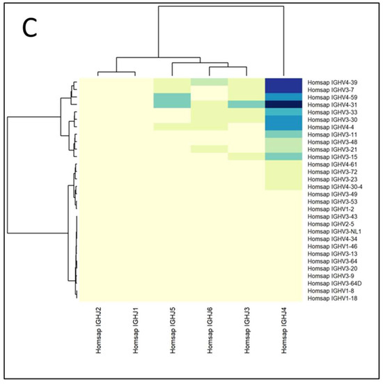 Clustered image maps depicting the relations between immunoglobulins’ VDJ genes of the immune library. (A) VD genes, (B) DJ genes, and (C) VJ genes. Darker colors on the heatmaps indicate the strongest associations between genes.