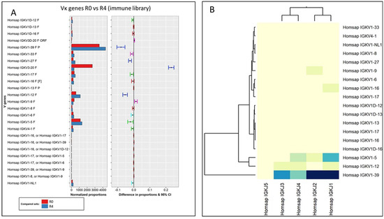 (A) Pairwise analysis of Vκ gene composition of the unpanned immune library (red) and its fourth round of selection (blue). Normalized proportions (left chart) and 95% confidence intervals of the differences in proportions (right chart) for each VH subfamily. The color of the intervals depicts test interpretation: non-significant (red), significant for all p-values (dark blue), significant for one test (light blue), and significant only Benjamini–Hochberg test (green). (B) Clustered image map depicting the relations between VJ (κ chains) genes of the immune library. Darker colors on the heatmap indicate the strongest associations between genes.