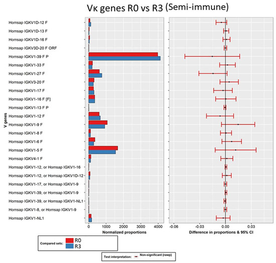 Pairwise analysis of Vκ gene composition of the unpanned semi-immune library (red) and its third round of selection (blue). Normalized proportions (left chart) and 95% confidence intervals of the differences in proportions (right chart) for each VH subfamily. The color of the intervals depicts test interpretation: non-significant (red).