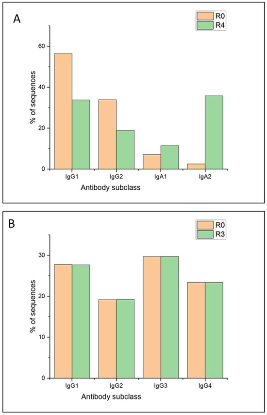 Antibody subclass composition of the unpanned immune (A) and semi-immune (B) libraries (R0, orange) and their last round of selection (green). Data were extracted from the alignment of the sequences of each round against the human genome, followed by counting sequences with the coverage function of the bedtools package.