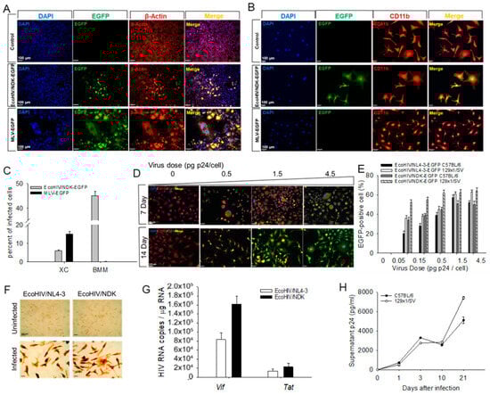 Comparison of EcoHIV and MLV infection of mouse and rat cells in culture. In mice, EcoHIV largely reproduces the tropism of HIV, productively infecting CD4+ lymphocytes, macrophages, and microglia [11,13,14]. This tropism differs from that of its envelope donor, ecotropic MLV, which mainly transforms CD4+ lymphocytes in mice [24,25]. In Figure 1, to probe viral target cells in culture, we employed rat sarcoma XC cells, often used to titer MLV infectivity [21], and primary murine BMM, which are reliably susceptible to EcoHIV [26]. Throughout the present study, infection was performed using EcoHIV expressing EGFP during productive infection, here employing clade B EcoHIV/NL4-3-EGFP and clade D EcoHIV/NDK-EGFP, also called EcoNL4-3 and EcoNDK, respectively. Both BMM and XC cells were susceptible to both EcoHIV clones (Figure 1A–C); however, they differed in the extent of their susceptibility, with 6% XC cells and 45% BMM positive for EcoHIV/NDK-EGFP (Figure 1C). In contrast, MLV failed to replicate in BMM (Figure 1A,B), consistent with its inability to productively infect resting cells [27]. The infection by EcoNDK was dose-dependent, and the progeny virus was infectious, as indicated by the increase in EGFP positive cells over time (Figure 1D). The BMM from C57BL/6J and 129x1/SVJ mice were susceptible to both EcoNL4-3 and EcoNDK, with more than 50% of cells of each strain infected by each virus at a dose of 1.5 pg p24 per cell (Figure 1E). Consistent with Figure 1A,B, BMM infected by either EcoNL4-3 or EcoNDK produced p24 (Figure 1F), which increased over time after infection (Figure 1H). The measurement of singly spliced (Vif) or multiply spliced (Tat) RNA indicates that both transcripts are expressed by both viruses, with EcoNDK being more productive.