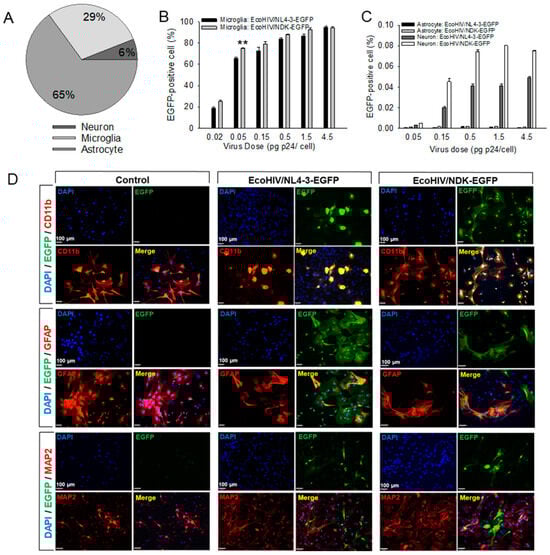 EcoHIV/NDK-EGFP and EcoHIV/NL4-3-EGFP infect predominantly microglial cells in mouse mixed brain cell cultures. (A) Cells were stained for nuclear marker DAPI (blue), microglia marker CD11b (red), and viral marker EGFP. (B,C) Cell composition of mixed brain cell cultures. Frequency of infection and dose–response to EcoHIV/NDK-EGFP or EcoHIV/NL4-3 in different cell types: (B) CD11b stained microglia ** p < 0.05, EcoHIV/NL4-3-EGFP vs. EcoHIV/NDK-EGFP, (C) MAP2 stained neurons or GFAP stained astrocytes. Please note differences in the Y-axis scales in (B,C). (D) Visualization of EcoHIV/NDK-EGFP or EcoHIV/NL4-3-EGFP CD11b-stained microglia, GFAP-stained astrocytes, and MAP2-stained neurons. Scale bar = 100 μm.