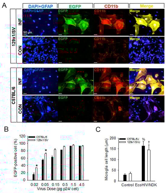 Comparison of susceptibility of mouse strains to EcoHIV in enriched glial cultures. Enriched glial cell cultures were prepared from brains of one-day-old 129x1/SVJ or C57BL/6J mice, and the experiment described in Figure 2 was repeated, infecting cultures with EcoHIV/NDK-EGFP (Figure 3). As in the experiment shown in Figure 2, microglia were productively infected (Figure 3A), but fewer than 0.02% of astrocytes were infected at a dose of 1 pg p24 per cell (please see Figure 2C). Microglia from both mouse strains were infected in dose–response manner to virus, with 129x1/SVJ cells slightly more susceptible than C57BL/6J cells (Figure 3B). In addition, microglia from both strains were enlarged significantly. The microglial lengths from uninfected C57BL/6J cultures averaged 28.8 ± 5.3 µm, and those from 129x1/SVJ averaged 35.4 ± 6.3 µm. However, in infected C57BL/6J cultures, microglial lengths averaged 163.3 ± 21 µm), and those in infected 129x1/SVJ cultures averaged 144.6 ± 23.4 µm (please see Table S2). These findings indicate that EcoHIV susceptibility is not restricted to one mouse strain and show that infection causes extensive microglial enlargement, as reported by the activation and inflammatory responses in the brain [28,29,30].