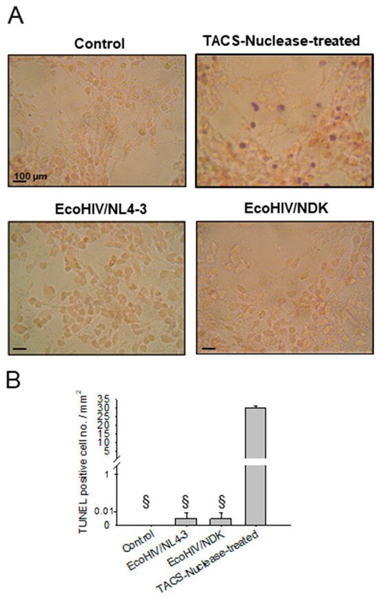 Neuropathogenic events during EcoHIV infection of mixed brain cell cultures. In infected mice, EcoHIV reproduces several HIV neuropathological events observed in brain tissues from people living with HIV (PLWH) who died with HIV-associated neurocognitive impairment (NCI), including synaptodendritic injury, downregulation of genes involved in neuronal signal transmission, increased brain glutamate levels, and dysregulation of brain lipid metabolism [13,14,15,16,31,32]. Apoptosis and neuronal loss have been observed in brain tissue obtained at autopsy from HIV patients who died with HIV encephalitis [33], but it is not a major finding from the brains of PLWH manifesting NCI [34] or in EcoHIV-infected mice with NCI [14]. To evaluate EcoHIV-associated apoptosis in culture, we performed a TUNEL assay using mixed brain cell cultures infected with either EcoHIV/NDK or EcoHIV/NL4-3; negative controls were uninfected cultures, and positive controls were treated with TACS nuclease (Figure 4). TACS-nuclease-treated cultures showed 30 TUNEL-positive cells/mm2; however, neither infection by EcoHIV/NDK nor EcoHIV/NL4-3 induced apoptosis in brain cell cultures, and infected cultures resembled uninfected cultures (Figure 4B). The absence of apoptosis observed here concurs with the measurements of apoptosis in the brain, performed in our previous studies of neurocognitive impairment in mice following EcoHIV infection by intracranial injection [14].