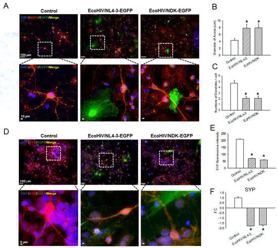 Changes in neuronal morphology in EcoHIV-infected mixed brain cultures. Mixed brain cell cultures from C57BL/6J mice were infected with the indicated virus for 7 days at 1 pg p24 per cell. (A–C) Cells were stained for neuronal marker MAP2 (red), viral marker EGFP (green), and DNA marker DAPI (blue). Scale bars = 100 μm (upper) and 10 μm (lower) panels. (A) MAP2-stained axons and dendrites were visualized: (B) axonal thickness and (C) dendrite number were measured using ImageJ software. (D–F) Cells were stained for neuronal SYP (red), viral marker EGFP (green), and DNA marker DAPI (blue). Scale bars = 100 μm and 5 μm. (E) Quantitation of SYP protein expression levels using ImageJ software. (F) SYP RNA expression level by QPCR. *: p < 0.01 uninfected vs. HIV infected.