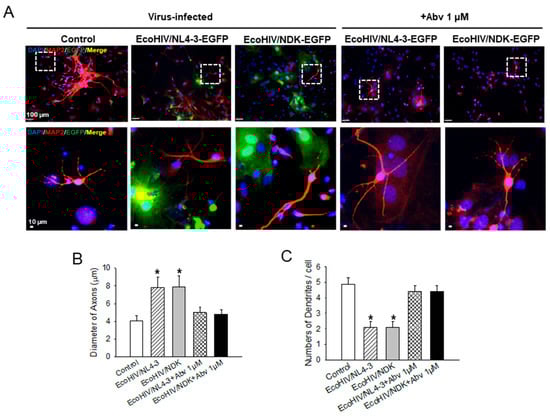 Isolated HIV gp120 envelope protein can impair neuronal function and kill neurons in tissue culture [37]. EcoHIV does not express gp120, but it clearly impairs neuronal functions in infected mice [13,14,15], as well as neuronal integrity in the mouse mixed brain cell cultures evaluated here. We investigated whether the neuropathogenic effects of EcoHIV observed in the present work (Figure 3, Figure 4 and Figure 5) require virus replication, presumably in microglia, or whether binding of the EcoHIV envelope MLV gp80 is sufficient. Mouse mixed brain cell cultures were established, as shown in Figure 2 and Figure 5, and left untreated or treated with 1 μM of the reverse transcription inhibitor, abacavir (ABV) [38], 24 h prior to EcoNL4-3 or EcoNDK infection. ABV was maintained throughout infection. As shown in Figure 6, infection of mixed brain cultures with either EcoHIV/NDK-EGFP or EcoHIV/NL4-3-EGFP resulted in a thickening of the axons and fewer dendrites displayed by neurons compared to those in uninfected cultures, confirming the alteration of neuronal morphology in EcoHIV-infected cultures (see also Figure 5). Please note that neurons were not directly infected; MAP2 positive neurons were not stained by EcoHIV-EGFP (Figure 6A). However, ABV terminated EcoHIV reverse transcription, presumably in microglia, and allowed for the maintenance of healthy neuronal morphology, including axonal thickness and the density of the dendrites. Thus, in murine brain cell cultures, the productive EcoHIV infection of microglia is required to indirectly impair neuronal integrity, as observed in infected mice [13,14].