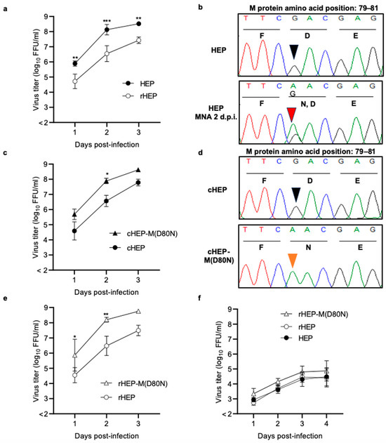 To confirm the enhancement in viral growth caused by the single substitution in the M protein, M(D80N), the recombinant HEP-M(D80N) strain, rHEP-M(D80N), was constructed using reverse genetics, and the viral growth of rHEP-M(D80N) was compared with that of rHEP. rHEP-M(D80N) grew significantly better in MNA cells than rHEP (Figure 1e) but not in DF-1 cells (Figure 1f). These results indicate that only one substitution of M(D80N) enhanced viral growth in MNA cells.