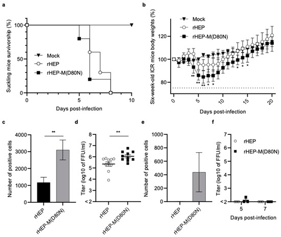 To compare the pathogenicity of rHEP and rHEP-M(D80N), 105 FFU of each virus was inoculated intracerebrally into suckling ICR mice (Figure 2a) and 6-week-old adult ICR mice (Figure 2b). Suckling mice infected with rHEP or rHEP-M(D80N) showed neurological signs at 4 d.p.i. and subsequently died at 5–8 d.p.i. (Figure 2a). For both strains, all infected adult mice survived until 20 d.p.i. and showed no clinical signs other than body weight loss (Figure 2b). These inoculated adult mice exhibited loss of body weight at 4 d.p.i and recovered from 7 d.p.i. Notably, mice inoculated with rHEP-M(D80N) showed a more significant body weight loss than those inoculated with rHEP.