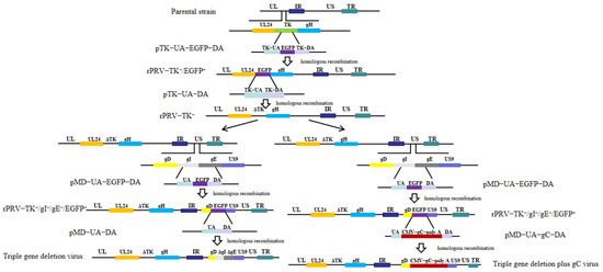 BHK-21 cells were cultured in Dulbecco’s Modified Eagle’s Medium (Procell, Wuhan China) with additional 10% FBS (Thermo Fisher, Waltham, MA, USA) at 37 °C with 5% CO2, and the propagation of PRV was used. The parental virus of the PRV-AH strain had been identified as a mutant PRV [33]. The plasmids pMD-UA-EGFP-DA, which contained the homologous arms of the gE/gI gene and the EGFP expression cassette, and pMD-UA-gC-DA, which contained the homologous arms of the gE/gI gene and the gC-His expression cassette, were generated, respectively, in our previous study [34].