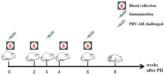 Immune procedure diagram. The mice were randomly divided into 6 groups and immunized at week 0 and week 3. Sera were collected at weeks 0, 2, 4, and 6. Mice were challenged with the PRV-AH strain at week 6, and the survival rates of mice were recorded from week 6 to 8.