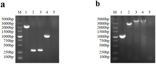 Verification of PRV the triple-gene deletion virus and the triple-gene deletion plus gC virus by PCR. (a) Verification of the TK region. M: DNA marker; 1: rPRV-TK−/EGFP+/gI−/gE−; 2: the triple-gene deletion virus; 3: the triple-gene deletion plus gC virus; 4: the parental strain; 5: cell control. (b) Verification of gI/gE region. M: DNA marker; 1: the triple-gene deletion virus; 2: rPRV-TK−/gI−/gE−/EGFP+; 3: the triple-gene deletion plus gC virus; 4: the parental strain; 5: cell control.