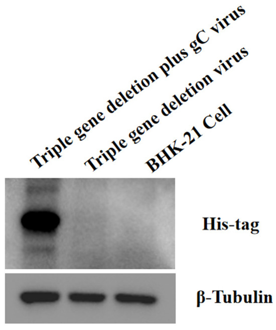 The triple-gene deletion virus and the triple-gene deletion plus gC virus-infected BHK-21 cells, respectively, and total proteins were extracted from infected cells for Western blotting. The result showed that proteins were only expressed in inoculated cells with the triple-gene deletion plus gC virus using His-tag McAb. These bands were in three forms, representing different glycosylation states of the protein. However, no protein band was detected in the cells infected with the triple-gene deletion virus or BHK-21 cells (Figure 4).
