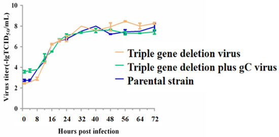 In order to evaluate the growth ability of the triple-gene deletion virus, the triple-gene deletion plus gC virus, or the parental strain, viruses were inoculated on BHK-21 cells and harvested every 8 h after inoculation. Then, the viral titers were tested, and the kinetics curves were drawn.