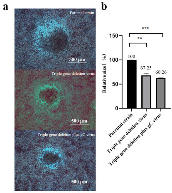 Comparison of plaque morphology and size of the triple-gene deletion virus, the triple-gene deletion plus gC virus, and the parental strain. (a) Plaques were stained with neutral red at 72 h after virus infection. (b) The average relative size of 20 plaques in each strain is shown as a percentage by setting that of the parental strain to 100% (** p < 0.01; *** p < 0.001).