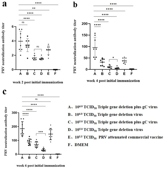 Anti-PRV neutralizing antibodies were examined at 0, 2, 4, and 6 weeks PII. As expected, no neutralizing antibodies were detected in mice before immunization. After booster immunization, neutralizing antibody titers increased significantly in each immunized group. The antibody titers immunized with the triple-gene deletion plus gC virus in mice were significantly higher than those immunized with the triple-gene deletion virus at the same 105.0 TCID50 dose after 6 weeks PII (p < 0.001). At 6 weeks PII, the NA titer was up to 1:184.75 in the triple-gene deletion plus gC virus group with 106.0 TCID50, while it was 1:89.45 in the triple-gene deletion virus group with the same dosage. Additionally, compared with the dose of 105.0 TCID50, 106.0 TCID50 of the triple-gene deletion plus gC virus or the triple-gene deletion virus was able to elicit a higher level of neutralizing antibodies. More importantly, in the triple-gene deletion plus gC virus group with 105.0 TCID50, the level of neutralizing antibody was close to that in the triple-gene deletion virus group with 106.0 TCID50 at 6 weeks PII (Figure 7).