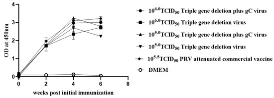 PRV-specific IgG antibodies were tested by ELISA in the sera of mice at the same time-points PII. The IgG titers increased gradually, and the peak was at week 4 or week 6 PII. Except for the DMEM blank control group, there were no significant differences among the immunized groups (Figure 8). A downward trend of OD values at 450 nm appeared in both 105.0 TCID50 dose groups from week 4 to week 6, which revealed that IgG antibodies maintained a short duration at low immunization doses.