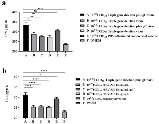 An immune response will be triggered when the viruses invade the host. Undifferentiated CD4+ T cells are stimulated to produce different T cell subsets activated by antigen-presenting cells, including Th1, Th2, Th17, and Treg cells. These immune cells play a key role in antiviral immunity by producing different cytokines. In this study, IFN-γ and IL-4 were measured as two representative cytokines. Compared with the DMEM control group, all groups immunized with vaccines induced higher levels of IFN-γ and IL-4. The highest levels of IFN-γ and IL-4 were in the triple-gene deletion plus gC virus group with 106.0 TCID50, which indicates that enhancing gC expression facilitated the production of IFN-γ and IL-4. IFN-γ can promote the differentiation of quiescent CD4+ T cells into Th1 cells, increase the secretion of Th1 cytokines, and improve cellular immune function. IFN-γ plays an important role in stimulating a PRV-protective immune response [47,48]. As a Th2 cytokine, IL-4 can activate B cells and facilitate the proliferation of T cells [49]. Therefore, higher levels of IFN-γ and IL-4 induced by the triple-gene deletion plus gC virus are beneficial to specific humoral immunity and cell-mediated immunity, which is consistent with the results of neutralizing antibodies and survival rate.