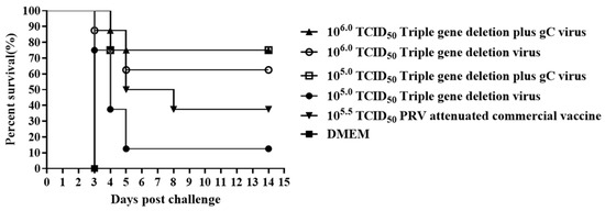 At 6 weeks PII, all groups were intramuscularly challenged with 105.5 TCID50 of the parental strain. All mice died in the DMEM control group and displayed typical PRV neurological symptoms before death. In the groups immunized with 106.0 TCID50, the survival rates of the triple-gene deletion plus gC virus group and the triple-gene deletion virus group reached 75% (6/8) and 62.5% (5/8), respectively. In the groups immunized with 105.0 TCID50, the survival rate of the triple-gene deletion plus gC virus group was 75% (6/8), while that of the triple-gene deletion virus group was only 12.5% (1/8) (Figure 10). According to the findings, at high immunization doses, there was no significant difference in the protection rate between the triple-gene deletion plus gC virus group and the triple-gene deletion virus group (ns, p > 0.5). However, at low immunization doses, it was significantly higher in the triple-gene deletion plus gC virus group than in the triple-gene deletion virus group (*, p < 0.05). In conclusion, the triple-gene deletion plus gC virus can elicit immunity more effectively than the triple-gene deletion virus at a lower immunization dose.