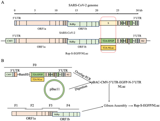 The cDNA sequences (5′UTR, M, E, N, ORF3a/b, ORF7a/b, ORF10, 3′UTR) were obtained from the genome of SARS-CoV-2 strain nCoV-SH01 (GenBank: MT121215.1) in a previous study [17]. The coding sequence of the Spike (S) gene was replaced with either T2A-EGFP or T2A-IgK-Nanoluciferase (NLuc), while retaining the transcriptional regulatory sequences. Using the overlap PCR method, various sequences, including CMV, HDV RZ (synthesized gene by GENEWIZ), BGH pA, and SV40 pA, were cloned into the pBeloBAC11 vector. This method employs Primer Star GLX (Cat. No. R051A; Takara, Ohtsu, Japan). PCR was performed to amplify the desired fragments, which are then cloned into the vector using homologous recombination. This resulted in the successful construction of intermediate plasmids pBAC11-5′UTR-EGFP-3′UTR and pBAC11-5′UTR-NLuc-3′UTR. The ORF1ab gene of SARS-CoV-2 was fragmented into 4 segments in the pCC1Bac-ORF1ab plasmid (Cat. No. PA11799; GENEWIZ, South Plainfield, NJ, USA), each with 40 bp homologous sequences at their ends. Fragments F1, F2, F3, and F4 were obtained using PCR amplification. These fragments were then assembled into the pBAC11-2-5′UTR-EGFP-3′UTR and pBAC11-2-5′UTR-NLuc-3′UTR vectors using Gibson Assembly HiFi Mix (Cat. No. A46627; Thermo Fisher Scientific). Following the previously established protocol for the pBeloBAC11 (Cat. No. P0908; Miaoling Biology, Wuhan, China) vector, the noninfectious replicon plasmids Rep-S-EGFP and Rep-S-NLuc were successfully obtained. In Rep-S-NLuc, a portion of the N gene coding sequence was deleted, and the NLuc coding sequence was inserted in the place of the S gene, resulting in the construction of Rep-N-NLuc. The replicon plasmids were extracted using the NucleoBond BAC 100 (Cat. No. 740579; Macherey-Nagel, Düren, Germany) maxi prep kit for large-construct plasmids.